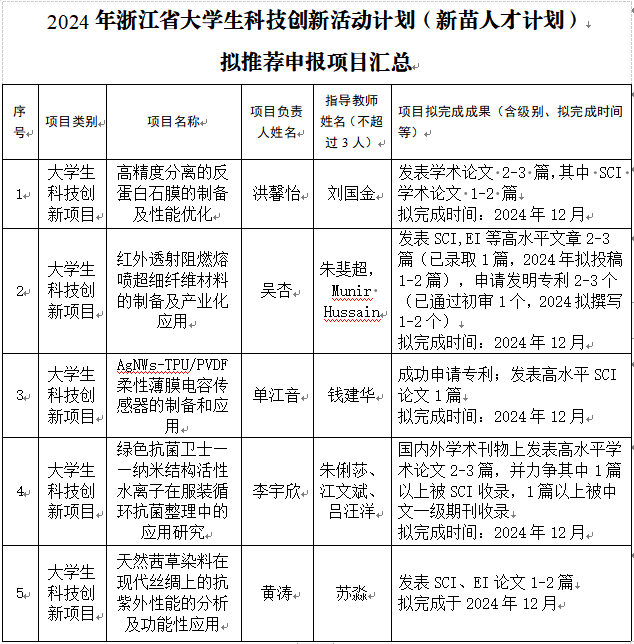 根据《关于组织申报2024年浙江省大学生科技创新活动计划(新苗人才计划)项目的通知》要求,学院共申报33项,经专家评审,学院拟向学校团委推荐5项,名单如下(排名不分先后),如有异议,请在公示期内向学院团委反映。